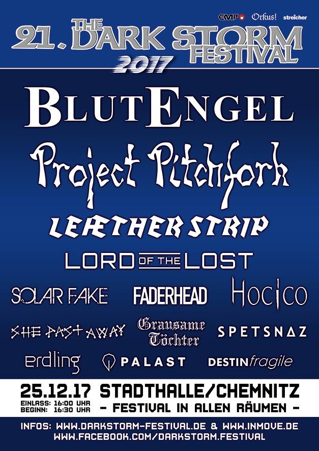 Több, mint 20 éve varázsolja el az elektro-gothic-industrial rajongókat karácsony első napján az idén is a chemnitzi Stadthalle-ban megrendezett Dark Storm Fesztivál. Már kapunyitáskor rengetegen várakoztak a bebocsátásra, szerencsére mindenki hamar bejutott a precíz szervezésnek köszönhetően. Az előcsarnokban egy kisebb piac fogadta a látogatókat, nemcsak ételt és italt lehetett vásárolni, hanem kedvenceink cd-it is beszerezhettük, illetve a ruhatárunkat is felfrissíthettük. Hiába voltunk kb. kétezren, a tömeg szépen eloszlott a két teremben.