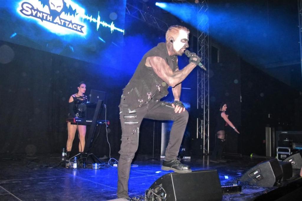 A kisszínpadon máris kezdett a SynthAttack. Az öt évvel ezelőtt Hannoverben megalapított dark-elektro duó eredetileg egy házaspár fejéből pattant ki, de a válás után a szintis otthagyta a bandát. Azóta új hölgy áll a szintetizátor mögött, aki se nem felesége, se nem barátnője az énekes Martin-nak, sőt két táncoslány is erősítette már a fellépéseket. Az együttes 2016-ban a M’era Luna fesztivál „újonc” versenyének a döntőjéig is eljutott, három albummal lett már gazdagabb és a múlt hónapban a legújabb kislemezük is megjelent, amiről az „Addicted to the thrill”-t be is mutatták nekünk. „Life is a bitch” pumpáló basszus találkozása a durva énekkel és az agresszív szintivel. Jól sikerült a Faithless-féle „Insomnia” feldolgozás is. A „Final salvation”-ben kellemesen szólt a szintis csaj hangja is. Az „Embrace your life” brutálisan jól táncolható, egy új titkos fegyver a dark-elektro, indusztriál és EBM területen.