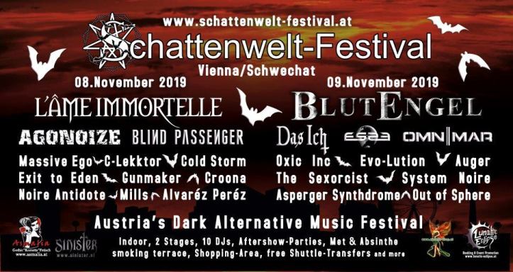 2 hónap múlva, november 8-tól 10-ig ötödjére kerül megrendezésre Ausztria legnagyobb gót és dark-elektro fesztiválja, a Schattenwelt. A helyszín továbbra is a főváros mellett lévő schwechati Multiversum, igaz idén utoljára. Az még a jövő zenéje, hogy a következő évben is meg lesz-e tartva a fesztivál más helyszínen, vagy ez lesz az utolsó ilyen megmozdulása az osztrák szervezőknek.