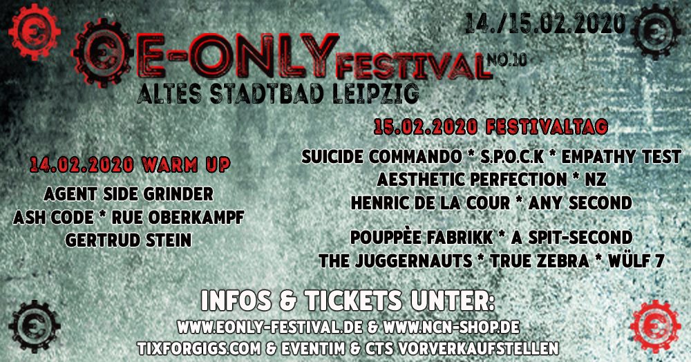10. alkalommal rendezik meg a lipcsei Altes Stadtbad-ban az E-Only fesztivált. A két napos rendezvény bemelegítő estéje éppen Valentin-napra esik, így szerelmesen összebújva pogózhatunk a meghirdetett zenekarokra. Pouppée Fabrikk, The Juggernauts biztosan lázba hozza az EBM rajongókat. Nem csalódnak majd a szintipop rajongók és a keményebb aggrotech ütemekre vágyók sem, S.P.O.C.K., Empathy Test, Suicide Commando, Aesthetic Perfection, csak hogy a nagyobbakat említsük.