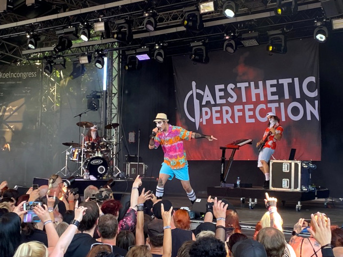 Sietnünk kellett, a nagyszínpadon máris kezdett az Aesthetic Perfection, azaz a Daniel Graves által 2000-ben létrehozott amerikai elektronikus zenei projekt. Védjegye egy kifejező show, amellyel a közönség elé tolta indusztriális popját. Egyszerű dallamok, amelyekre együtt táncolhattunk, mellette lágy ének, néha bátor kiáltások vagy egy effektek által torzított robothang. Daniel énekjátéka szenzációs volt. A nagyon tiszta ének és a mély morgással párosított, rendkívül erőteljes énekhangok keveréke igazi hallgatási élvezetté vált. Sorra jöttek a slágerek: „Gods And Gold”, „Rhythm+Control”, „Never Enough”, „Antibody”, „Spit It Out”, „The Dark Half”. Pozitív, szimpatikus modorával azonnal maga mellé állította a rajongókat. A koncert jobb volt, mint ahogy Daniel kinézett, a színes batikolt ing, a világoskék rövidgatya (ami mindig le akart róla esni), a csíkos térdzokni, a necc kesztyű, a szalmakalap és az a bajusz valahogy nem illet az összképbe.