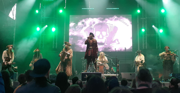 Az estét a 2008-ban alakult Ye Banished Privateers svéd folk-rock együttes kezdte. 300 évet vittek vissza minket az időben, egy képzeletbeli utazásra hívtak a 18.századi tengeri életen át. Dalaikra a hagyományos ír és skandináv népzene volt hatással, szövegeik pedig leginkább a tizenhetedik és tizennyolcadik században történt eseményekről szóltak, meséltek a törvény túloldalán megélt kemény tengerész életről, az elnyomás és a nacionalizmus elleni harcról. A koncert során kalózokat játszottak, történelmi ruhákat viseltek és színészkedtek is, ezáltal a fellépésük a zene és a színház keveréke volt. A 20-30 fős legénység felváltva turnézik, így sosincs két egyforma előadás. Táncra és éneklésre csábítottak mindenkit, a balladák pedig a legkeményebb kalózszíveket is meglágyították.
