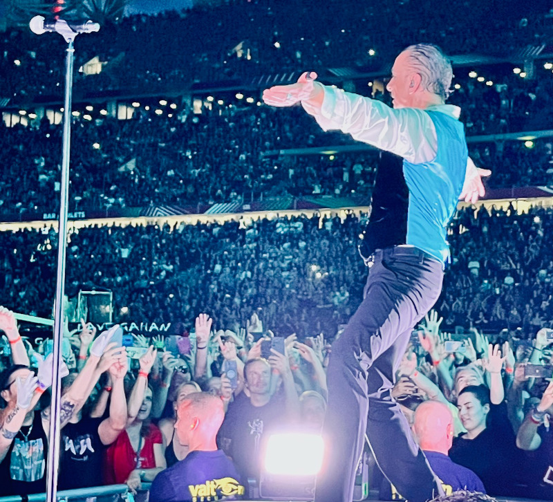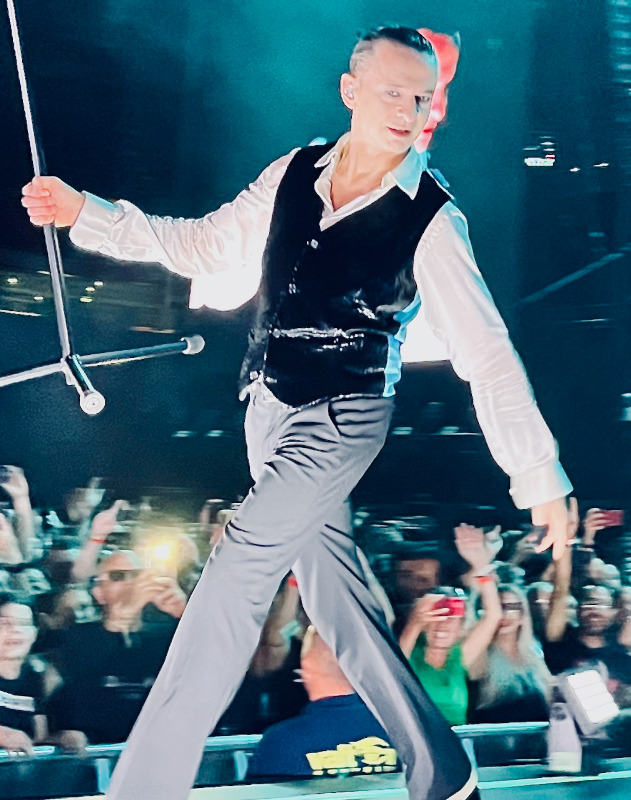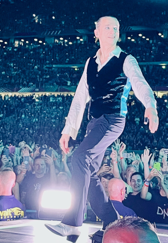 Az eddigi tűpontos időpontokat felülírva 20:45 helyett már 20:20.-kor lekeverték hirtelen a DJ szettet, és máris jött a Speak To Me kőkemény intrója, ami persze azonnal a My Cosmos Is Mine-ba ment át. Először Martin jött be jobbról a színpadra, hatalmas üdvrivalgást kiváltva, majd a zenésztársak is elfoglalták a helyüket. Andy helye nagyon üresnek tűnt a színpadon… Utolsóként Dave is megérkezett, elegáns öltözékben, kihívóan lépdelt, majd meghajolva a közönség előtt, hogy aztán azonnal hátat fordítson nekik és térdrogyasztós „jógapozícióba“ helyezkedett. A Cosmos zord kezdése után nagyon jólesett a Wagging Tongue nosztalgikus Kraftwerk-megidézése is, a „watch another angel die“ volt az első sor, amit a közönség először énekelt. De persze a buli a Walking In My Shoes-tól indult be: már az elején elindult az előző turnéról ismerős “töpptöröpptöröpp” éneklés a közönség soraiból. Dave hozta a szokásos „kezemet a szívemre teszem“ mozdulatot is a „But I promise now my judge and jurours“ sornál. A kifejezetten monumentálisnak ható színpadkép elsőként az It’s No Good szamaras kivetítésénél nyűgözött le; a dalt magát én tudnám hanyagolni DM koncerteken. A következő dal, a Sister Of Night viszont nagy jutalma a Memento Mori turnénak: noha borítékolható, hogy az őszi amerikai szakaszra kikerül a setlistből, most nagyon kellemes meglepetés, hogy folyamatosan szerepeltetik. Az albumverzióhoz hasonló, de a végén újra beinduló Tour Of The Universe-változatot játszották, Dave énekével. Az In Your Room következett, aminél meg kellett állapítanunk, hogy a helyünkről nemcsak nem igazán hangos a koncert (néha túl tudtuk énekelni Dave-et), hanem a zsúfoltabb, kásás dalok nem igazán szólalnak meg jól, ugyanakkor a szellősebbek (mint az említett Sister Of Night, vagy az akusztikus dalok később) kristálytisztán szólnak. Az Everything Counts Global Spirit Tour verziója következett, és Dave itt jött ki először a kifutóra, a közönségénekeltetéshez (ezúttal nem volt „you’re really are the best Budapest“). A Precioust szinte végigtapsoltuk, majd elérkeztünk a setlistvariálós részhez. A Speak To Me-ben reménykedtem, de már láttam, hogy Peter Gordeno basszusgitárral lép a színpadra, így tudott volt, hogy a My Favourite Stranger következik. Szerintem ez a leggyengébb dal a Memento Mori lemezen, és most sem nyűgözött le, noha a mögöttem éneklő rajongó annyi érzéssel énekelte a dal utolsó sorait, hogy valamit talán megéreztem a dalból. Szintén nagyon bíztam a Home helyett az A Question Of Lust-ban, és imáim meghallgattattak, Martin gyönyörűen énekelte a Black Celebration nagy slágerét, és persze a dal végén ő is megjárta a kifutót. Még majdnem közönségénekeltetés is volt, amit pedig csak a Home-nál szokhattunk meg. Nem hittem, hogy a Soul With Me helyett mást kapunk, de Martin nagy meglepetésre a Strangelove-ot adta elő, ami szerintem kitűnően sikerült; noha 2018-ban már hallhattuk, most valahogy nagyobbat ütött. Annyira örültem, hogy üvöltöttem a dal első taktusainál, hogy „ez mi?! EZ MI?!?“