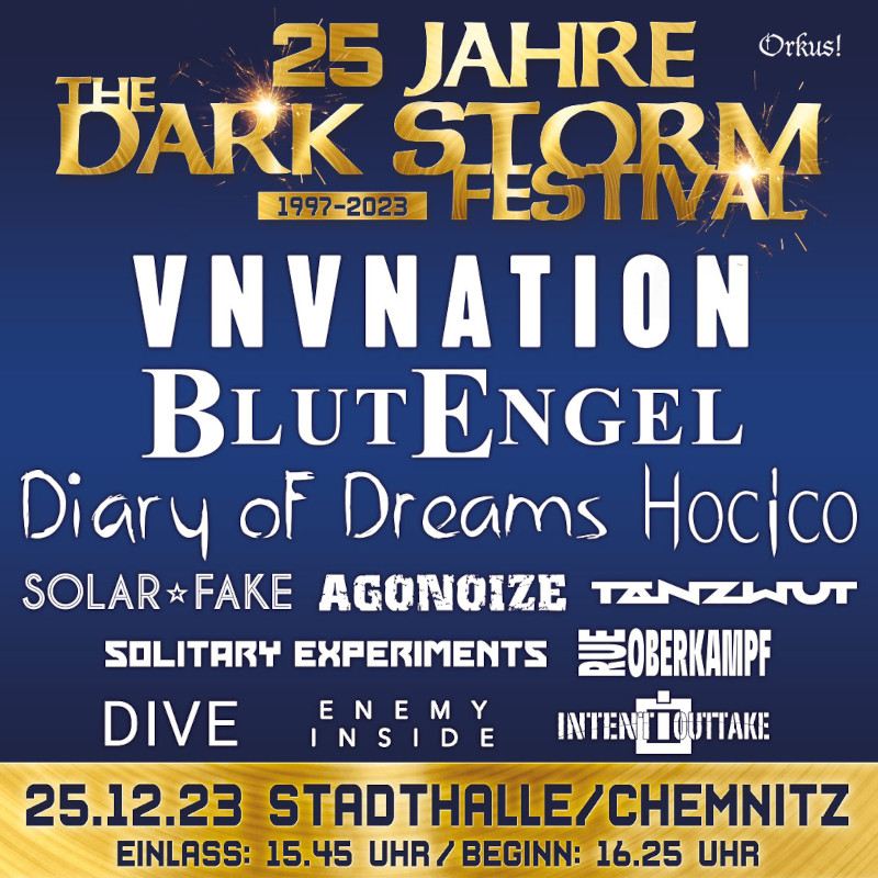 Már 25 éve sötétül el Chemnitz minden évben karácsony első napján és varázsolja el az elektró-gothic-indusztriál rajongókat idén is a városházán megrendezett egynapos fesztivál. A Dark Storm a két és fél évtized alatt a legnagyobb beltéri szcénatalálkozóvá fejlődött, egész Németországból és a szomszédos európai országokból várja a látogatókat. Akik el akarnak menekülni az ünnepi giccs elől, azokra két színpadon is kellemes fekete potpuri vár. A koncertek kora délután kezdődnek és éjfél körülig tartanak. Fellép majd a VNV Nation, Solar Fake, Agonoize, Hocico, Blutengel, Diary of Dreams, Solitary Experiments, Tanzwut, Rue Oberkampf, Intent:Outtake, Dive, hogy a legnagyobbakat említsük. Akinek még bírja a lába, az átballaghat a város legrégebbi klubjába, a Rókalyukba, ahol a hivatalos afterparti kerül megrendezésre. Az előcsarnokban egy kisebb piac fogadja a kb. kétezer látogatót, ahol nemcsak ételt és italt lehet vásárolni, hanem kedvenceink cd-it is beszerezhetjük, illetve a ruhatárunkat is felfrissíthetjük.