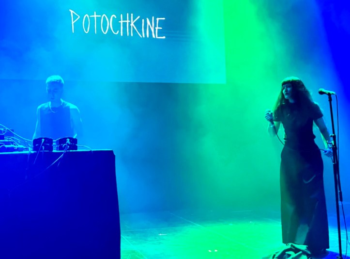 Ami a színpadképet illeti, ennek pont az ellenkezője következett. A kisteremben játszó francia Potochkine ugyanis megelégedett a laptoppal, a keverőgéppel, két mikrofonnal (az egyik a zengető/visszhangozó effektussal) és egy képernyővel, ahol 50 percig nem villogott semmi, csak a zenekar neve. De ki panaszkodhat erre, amikor olyan erőteljes hangzás szabadult a közönségre? A dark wave, a dark technó és az EBM közé sorolható ütemek a belső fedélzeten kalapáltak. Pauline frontnő énekelt, sikított, vinnyogott, sóhajtozott és arra is időt szánt, hogy meglátogassa az első sorokban állókat és úgy táncoljon, mint a közönség a találóan elnevezett „Pogo” közben. Ha friss, lendületes elektronikus hangzásra vágysz és nincs gondod a francia nyelvvel erősen ajánlott a duó, akik újra feltalálták az EBM-et a technó, a szintipunk és a cold wave izzó feketeségén. A színpad a lábuk alatt szinte szakrális hellyé változott, táncra késztette a transzba lépett testeket a „Possédée”, „La Féte de Narcisse”, „Les Chevaux”, „Je Deteste Attendre” dalokkal.