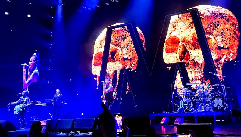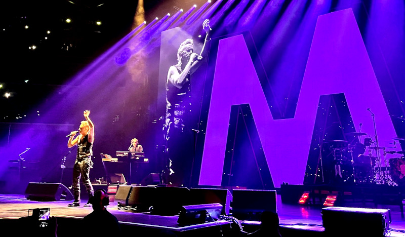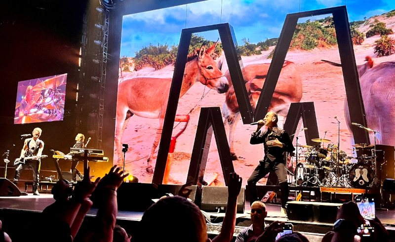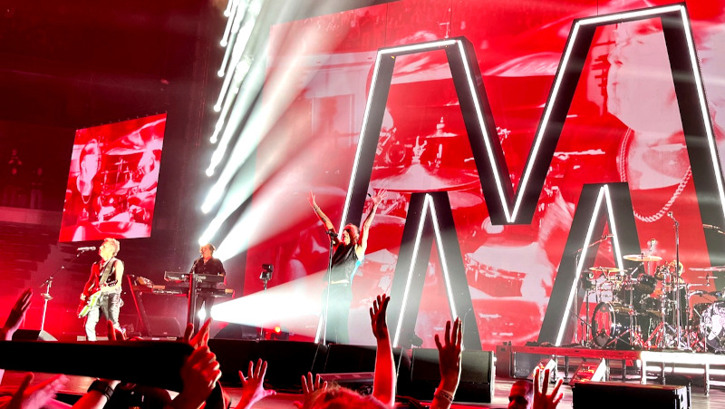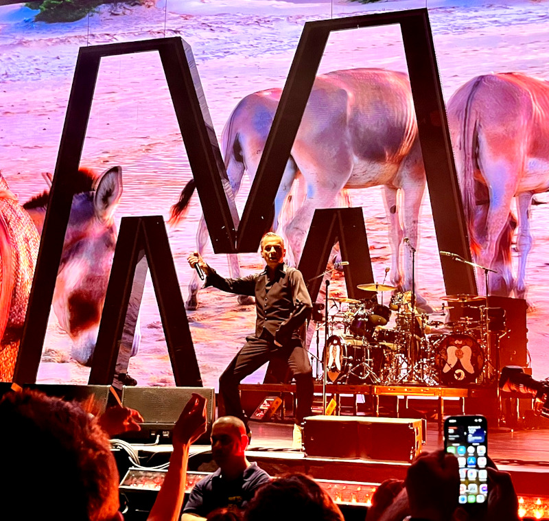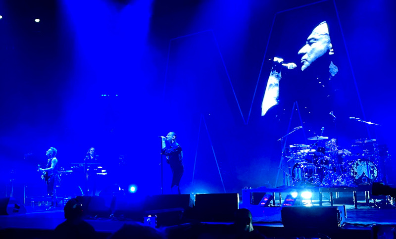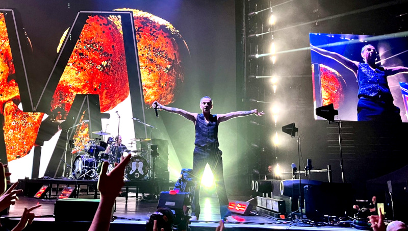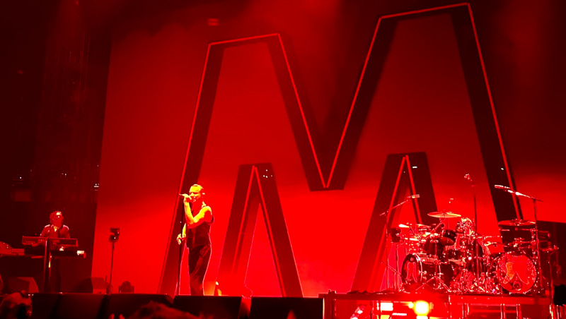 A Martin DJ-szett szögelősebb dalai következtek, majd 20:43.-kor hirtelen lecsavarták a fényeket és már indulhatott is a Speak To Me intrója. Most először fogalmazódott meg bennem, hogy azért ezek a hangok kicsit túlzottan emlékeztetnek az In Chains nyitányára, de még a The Dead Of Night „ítéletnapi harsonái“ is beugorhatnak. Aztán máris érkeztek a My Cosmos Is Mine húsbavágó dobjai és az már egyből látszott, hogy hangerőnek nem leszünk híján ma. Az egész koncert kifejezetten hangosan, tisztán, néha már-már kissé túlzottan is tolakodóan, helyenként „kukorékolóan“ szólt, a dobok pedig néha elnyomtak minden mást. A Cosmosnál kisétált a zenekar, utolsóként Dave, aki a szokásos guggolós jógapózzal köszöntötte a közönséget, amely póz talán a mögötte látható M betűt akarja utánozni. A Cosmos sötétsége után képletesen és szó szerint is fénybe borult a színpad, hiszen jött a Memento Mori számomra messze legjobb dala, a Wagging Tongue. A panaszos Kraftwerk-tiszteletadás után Dave többször megköszönte a közönség reakcióját, majd jött egy kissé elhadart „good evening Budapest!“ is. Következett a Walking In My Shoes, a Global Spirit Touros „rockszörny“ változatban, és megvolt az elmaradhatatlan dobszóló is Dave „Christian!“ felkiáltása után.