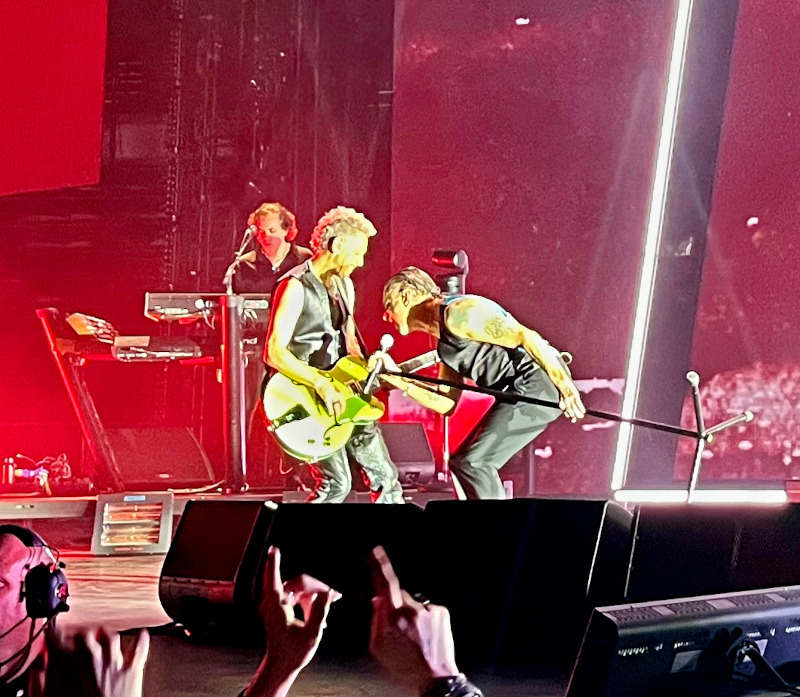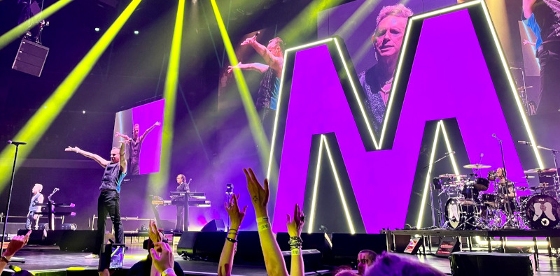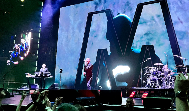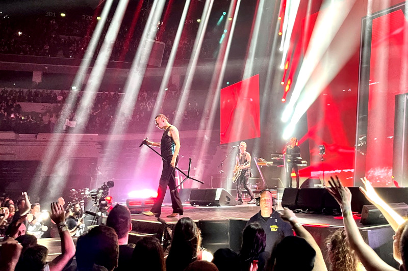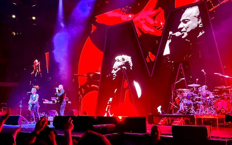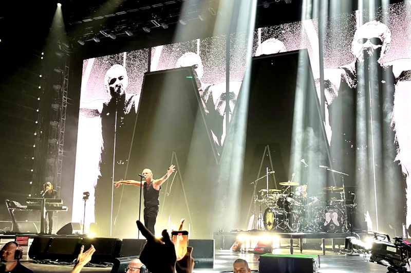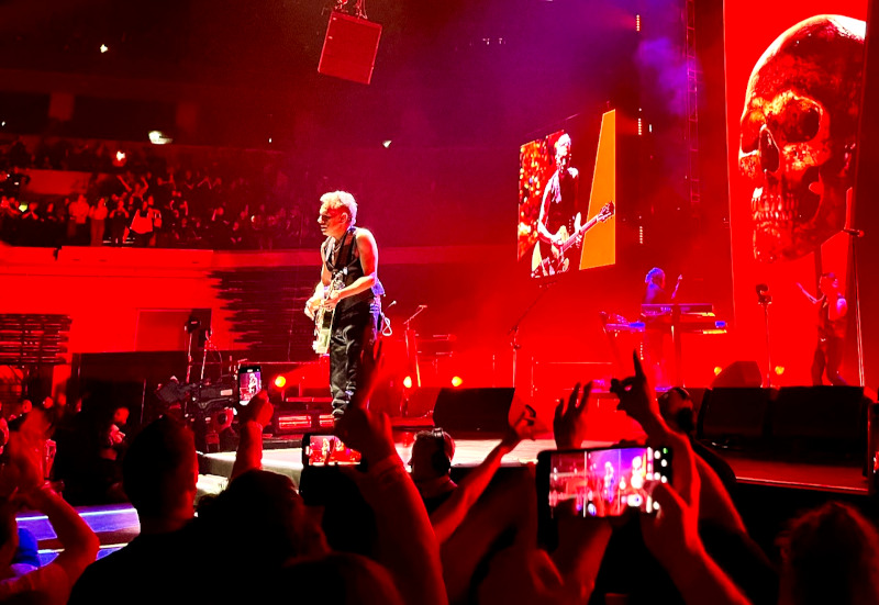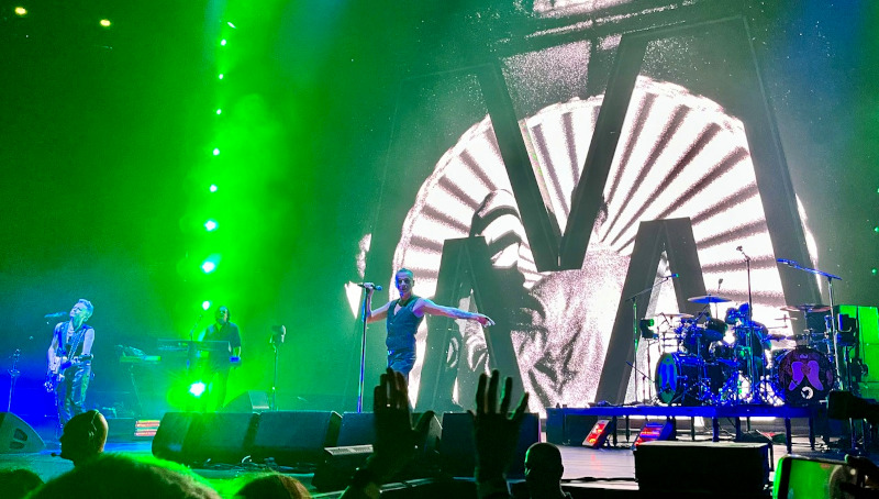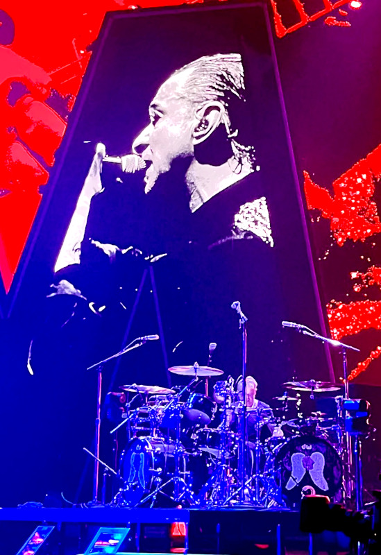 A Ghosts Again alatt Dave kétszer is bemutatta védjegyszerű pörgését, amit az A Question Of Time-ból ismerhetünk – a Memento Mori slágerére egyébként meglepően nagy üdvrivalgással reagált a közönség. Az örvendetesen rövid I Feel You következett, a végén ment az ökölpacsi Dave, Martin és Christian között. Az újkori koncertklassissá váló A Pain That I’m Used To refrénje alatt szinte húsklopfolószerűek voltak a dobok, majd aztán jött a „retro blokk“. A Behind The Wheel óriási üdvrivalgást kapott, bár talán én még nagyobb tombolást is el tudtam volna képzelni, egy kicsit mintha kifáradt volna a tömeg a kifejezetten erős koncertkezdet után. A dal végén felvillant a kivetítőn Andy félig letakart szemű, Violator-korszakból származó fotója, miközben Dave a dalt a billentyűs emlékének ajánlotta, a végén az ég felé mutatva. Ezután kifejezetten nagyot ütött a Black Celebration monumentális új verziója – nem lehetünk eléggé hálásak, hogy ezen a turnén nem a felére lelassított Exciter és Delta Machine Touros változatot játsszák! Jött a másik 1986-os klasszikus, a Stripped, éles szintihangzással (de jó lett volna hasonló az Everything Counts-ba is, ahol a dobok gyakran elnyomták a billentyűs hangszereket), majd a John The Revelator setlistből történő kiejtésével máris az Enjoy The Silence következett. Sokat szomorkodtam már János Apostol kiszórásán, de el kell ismerni, hogy elég jól „gördült“ így a négyszámos retróblokk! Az Enjoy The Silence kivetítése turnéról turnéra szörnyűbb, de ha ettől elvonatkoztat az ember (nem könnyű!), akkor élvezetes a dal, táncolt mindenki boldogan a fényárba boruló stadionban.