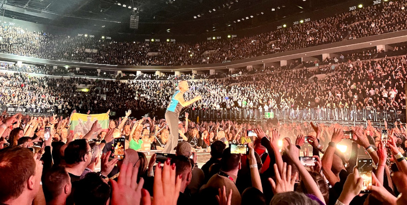 Nekem kifejezetten kellemes közönség jutott. Meglepetésemre szinte csak magyarok ültek körülöttem, és senki sem zavarta meg az élményt, még akkor is sűrűn elnézést kért mindenki, amikor vécére kellett kimenni. Jó korán érkeztem, kényelmesen elhelyezkedem (pirospont az MVM Dome-nak, hogy nem volt kötelező letenni a kabátot, így az a lábamnál pihent végig a koncerten), és máris bőszen Shazamozhattam a Martin által összerakott techno DJ szett dalait. Itt jegyezném meg, hogy sok rosszat hallottam az MVM Dome székeiről, de ennek majdhogynem az ellenkezője igaz, kifejezetten kényelmes ülésem volt, és még a lábamnak is bőven volt hely. További pluszpont, hogy bőségesen volt internet-elérhetőség, pedig más arénákban ezzel azért szokott probléma lenni.