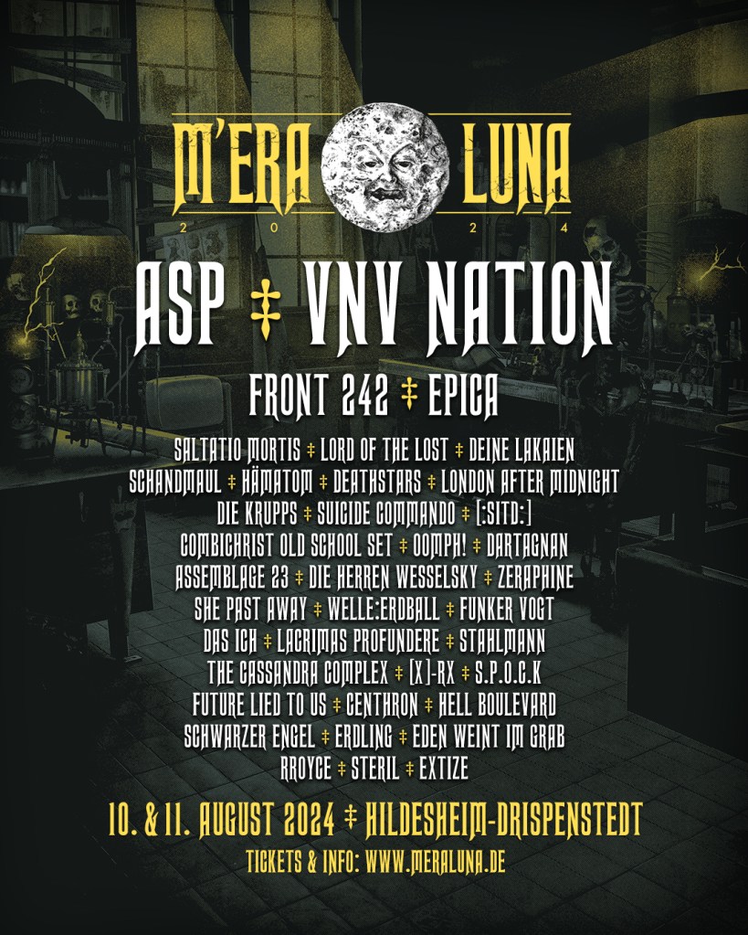 Augusztus második hétvégéjén ismét 25.000 látogató találkozik a világ minden tájáról a M’era Luna fesztivál alkalmából a Hildesheim-Drispenstedt repülőtéren, ahol az első osztályú koncertek mellett a családias légkör és a támogató program is fontos szerepet játszik. Péntek este hivatalos előpartival kedveskednek a látogatóknak, ahol a talpalávalót idén is valamelyik együttestag fogja szolgáltatni, aztán két napon keresztül párhuzamosan két színpadon fognak játszani a dark-elektró szcéna legütősebb együttesei. A VNV Nation, Future Lied To Use, Assemblage 23, Welle Erdball, Rroyce, S.P.O.C.K megdobogtatja majd a szintipop, az ASP, London After Midnight, Deine Lakaien, Zeraphine, Das Ich, She Past Away pedig a darkwave/gót rajongók szíveit. Nem csalódnak majd a keményebb aggrotech ütemre vágyók sem, Suicide Commando, Combichrist S.I.T.D., XRX, Centhron, Extize bandáktól bizonyosan verejtékes lesz a homlok. Az ős EBM-esek is találnak kedvükre valót a Front 242, Die Krupps, Funker Vogt személyében. Aki metálosabb hangzásra vágyik, az rázhatja a haját az Epica, Lord Of The Lost, Deathstars, Saltatio Mortis, Lacrimas Profundere, Schandmaul, Stahlmann, Hämatom, Schwarzer Engel koncertjein. Ha pedig még hajnalban is tovább szeretnétek pörögni, megtehetitek a koncertek utáni afterpartin.