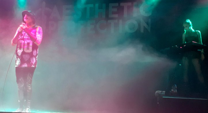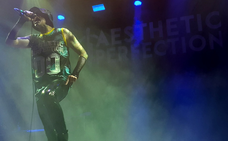 A kisszínpad utolsó fellépője az amerikai Aesthetic Perfection volt, aki a Fronline Assembly lemondott koncertje helyett lépett fel. A most AP-s 00-ás számú focimezben és a szokásos lakk sapiban megjelenő Daniel Graves által vezetett csapat nagy népszerűségnek örvendett, az énekes többször is elmondta, hogy idén a tengerentúlon turnéznak és ez az egyetlen európai fellépésük, így nagyon örült, hogy itt lehetett ma este. Személy szerint én is jobban örültem nekik, mint az FLA-nak. „Sötétség van, csak gyűlöletet és háborút szül belső konfliktusunk” – kiáltotta kezdésnek Daniel a „Gods & Gold” című szám elején. Segítségére volt a hangulat fokozásában a doboknál Joe és a szintetizátor/gitárnál Constanze is. Legyen szó az „American Psycho” és „Antibody” gömbölyű elektró hangzásvilágáról, a „Spit It Out” és „The New Black” kalapáló üteméről, a „Rhythm+Control” és „SEX” átható gitárjairól, a közönségkedvenc „Never Enough” és „Inhuman” dalokról, a márciusban megjelent „Monochrome” élő debütálásáról vagy a „The Dark Half” és „Automaton” szédületes magasságairól, Daniel Graves segédkezésével felfedezhettük az ipari pop határait, miközben olyan mély témákat érinthettünk, mint az önreflexió, a halandóság és a csalódás. A koncert végén persze hatalmas tapsolás volt, a banda vissza is jött, az énekes elmondta, hogy még egy számmal ugyan készültek, de már nem maradt idő, így szomorúan vettük tudomásul, hogy ennyi volt.