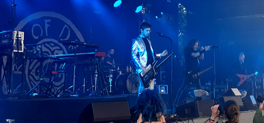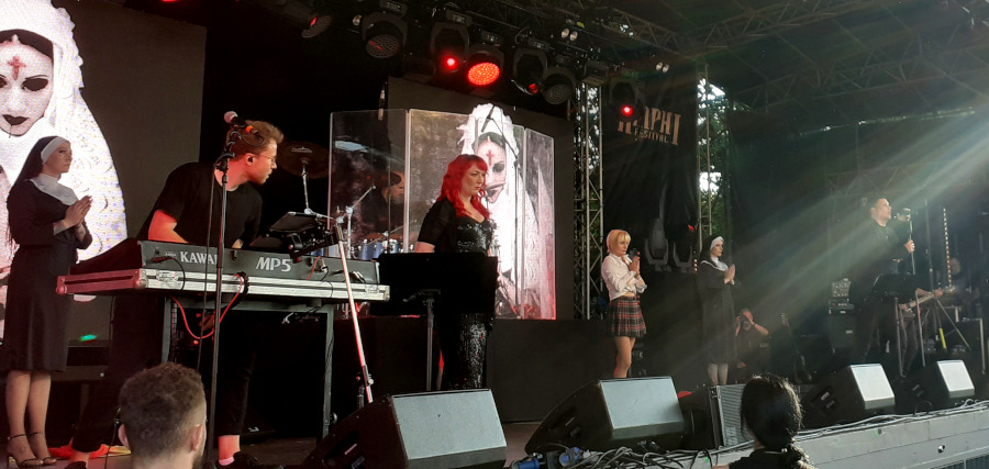 Nagyon erősen gondolkodtam, hogy megpróbálkozzak-e az Orbit színpadon fellépő Deus Ex Lumina bandával, de a tavalyi, hajóra várakozó hatalmas sorra visszagondolva nagy bánatomra le kellett mondanom róla és maradtam a Színházteremben, ahol a Dark formáció következett, azaz a darkwave/gót/post-punk énekes és dalszerző Hamburgból. Első digitális kislemeze, a Forever Suffer 2020 júniusában jelent meg és gyorsan szenzáció lett a nemzetközi alternatív/sötét színtéren. Egyik sikeres sláger a másik után következett, majd 2020 novemberében lemezszerződést írt alá és bejelentette első Nightmare című EP-jét. Nevükhöz hűen igazi dark műsort adtak elő, gyertyákkal körbevett szintetizátor, festett arcú, mély hangú énekes, csinos vendégénekesnő, lakkruhás táncoslányok, minden volt, ami egy gót rajongó szívét megmelegítheti.