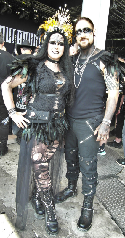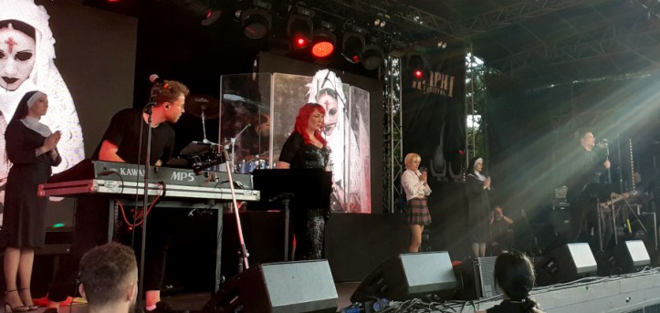 Következő a nagyszínpad programján a német gótikus szcéna popsztárjai, a berlini Blutengel. Chris Pohl énekes kétségtelenül káprázatos személyiség, akire egyesek szenvedélyesen, mások meglehetősen szkeptikusan tekintenek. De még ha a Blutengel-kritikusok közé tartozol is, el kell ismerned a karizmatikus telivér zenésznek, hogy koncepciója jól átgondolt, műsorai pedig vizuálisan rendkívül változatosak. Énekileg lassan húsz éve támogatja a tehetséges Ulrike Goldmann, akinek kifejező énekhangja olyan darabokat adott, mint az első számként leadott „Black”, „Lucifer” „Reich Mir Die Hand”, „Bloody Pleasures”, „You Walk Away” és a közönségénekeltetős „Engelsblut”. Az énekes színpadra szólította Sven Friedrich-et is, akivel együtt adták elő a két hete megjelent közös, „Nothing Left” dalukat. Vicces volt, hogy Sven nadrágjában maradt a telefon, le is tolta (sajnos nem a nadrágot :D) Chris érte, hogy ilyen felkészületlenül jött ide. Szokás szerint az egész műsort optikailag kísérte számos vonzó táncosnő felbukkanása, akiknek erotikus, provokatív mozdulatai igazi csemege volt a szemnek, főleg a férfi látogatóknak. Sok művért használtak fel, amiben a hiányosan öltözött hölgyek élvezettel heverésztek. Úgy tűnt ez nagyon tetszett a közönségnek, így az egy óra játékidő és sok gyönyörű pillanat után a banda hatalmas taps kíséretében távozott a pódiumról.