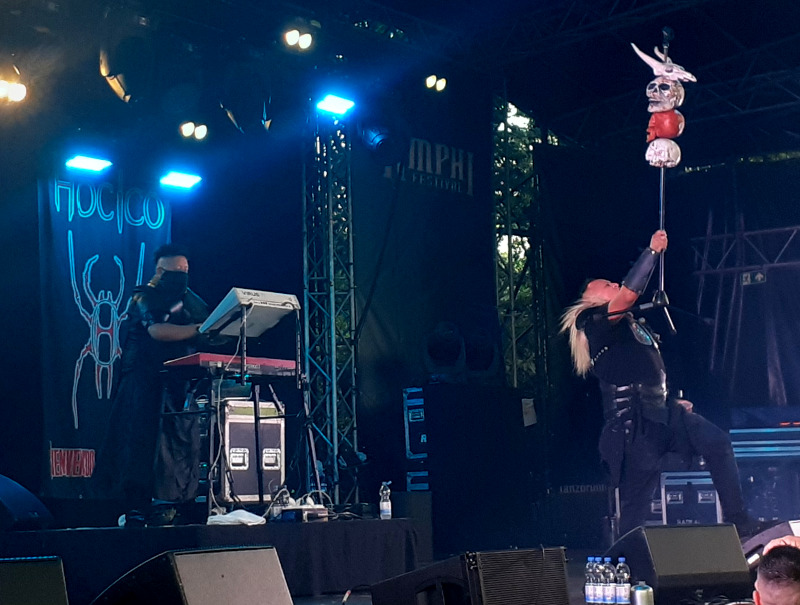 A hard elektró barátai foglalták el a helyüket a nagyszínpad előtt, következett a mexikói Hocico. Bár még mindig nagyon esett, de sikerült fedett részre beállnom, így tudtam párat fotózni is. Racsó segítségével az elektronikán, Erk Aicrag énekes végigsöpört a színpadon és jó hangulatot teremtett az olyan dalokkal, mint a „Bite Me!”, „Dog Eat Dog” vagy „N.W.O.”. Erk impozánsan nézett ki harci páncéljában, többször is a magasra emelte a koponyás mikrofonállványát, hergelte a közönséget, Racsó pedig jól látta az emelvényéről a mulatozó tömeget, ahogy az összes fekete póló vagy a fázósabbaknál kabát mozgott és örömtáncot járt. Az biztos, egy láb sem maradt mozdulatlan. Bármennyire is szuper volt a légkör, sajnos rohannom kellett tovább.