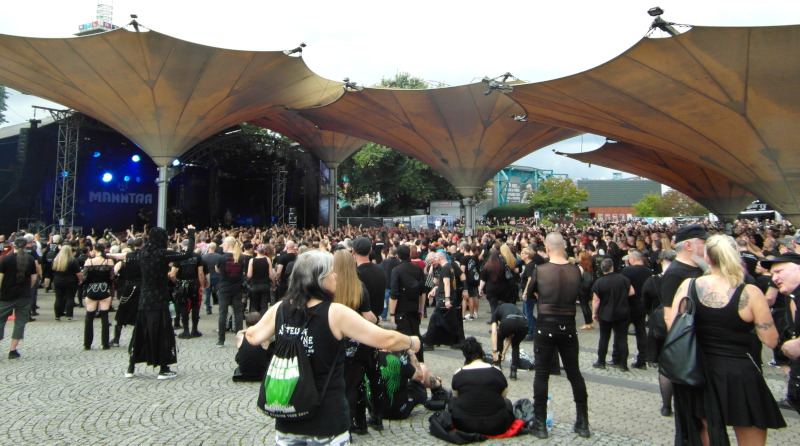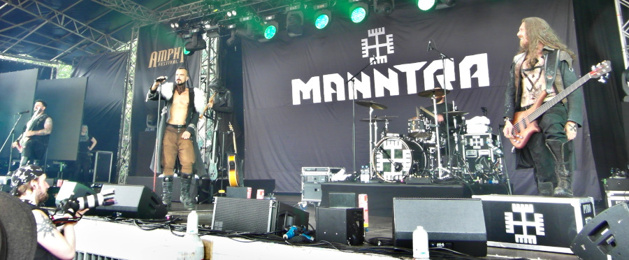 Őket követte a horvát Manntra zenekar, aki a metált, a gót, a folk és az indusztriális zenét ötvözte hagyományos elemekkel és modern hangszerekkel. Zenéjük bepillantást engedett a történelembe, a folklórba és a mitológiába. Michael Rhein az In Extremo-ból felismerte a bennük rejlő lehetőségeket és támogatta őket a turnékon, ami népszerűséget és számos koncerten és fesztiválon való megjelenést hozott nekik. Szó szerint tüzes műsort nyomtak a lángszórókból, az énekes is mindent elkövetett, hogy a hölgy látogatókat is megnyerje, pogány szőrmegúnyája láttatni engedte kidolgozott hasizmát, a haláljelmezben lévő gitáros pedig a pasikra ment rá, egy szörfdeszkát engedtek a közönségre, ő pedig ráállt és úgy szörfözött a fejük felett. Úgy láttam, hogy sok embert felpörgettek.