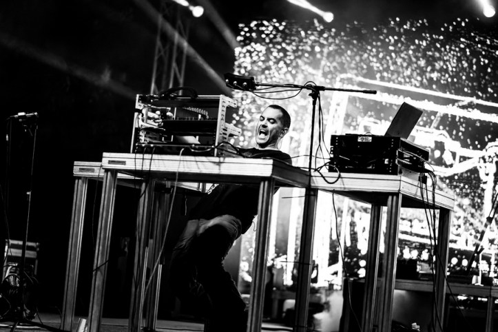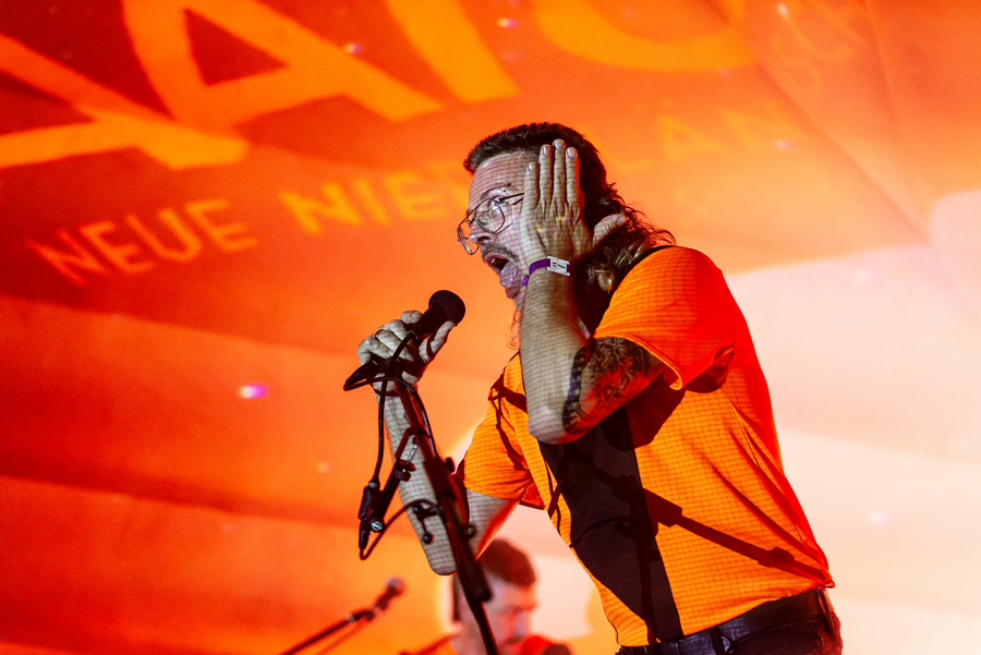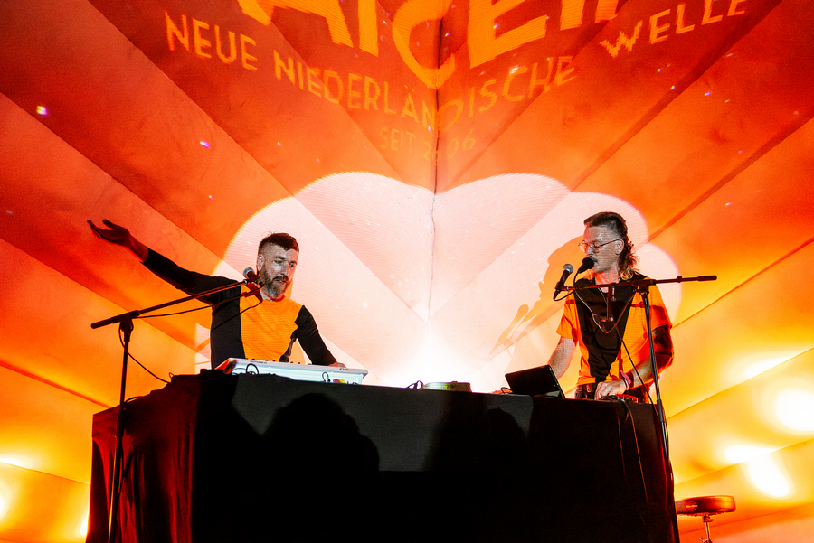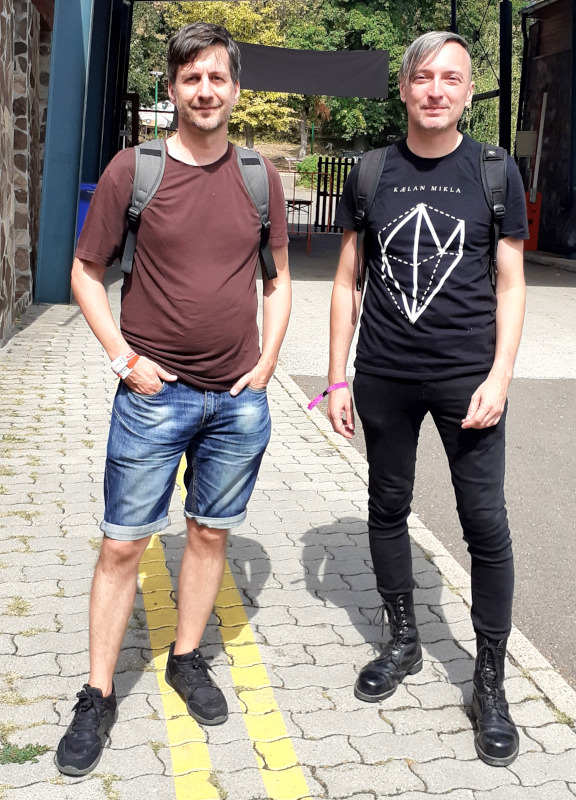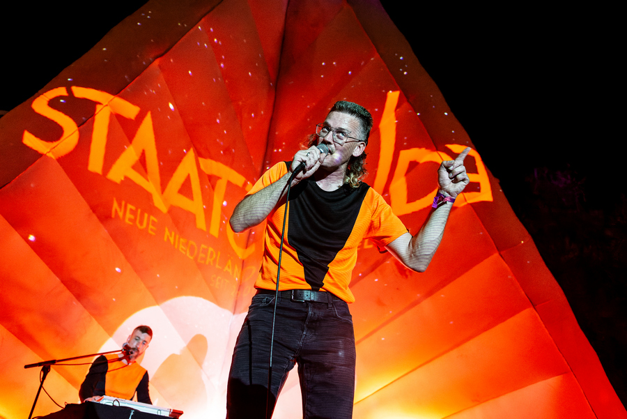 Csütörtökön a beosztásom miatt nekem az első banda a Delta színpadon fellépő Staatseinde volt, akik magával ragadó élményt nyújtottak a lüktető elektronikus és a nosztalgikus hangok ötvözésével. A holland EBM duó kezét nem kötik műfajok, felhozatalukból visszakacsintott a wave, a punk, a technó, a Neue Deutsche Welle (vagy inkább a „Neue-Niederländische-Welle”, azaz az új holland hullám, ahogy magukat nevezik) is és mindezek izgalmas alfajai. A hágai gyökerű Der Neo (aki a bundesliga frizurájával borzolta a kedélyeket) alapító tagra az indusztriál, grunge, hardcore, shoegaze és a gótika hatott, de ezeket jellegzetes nyers elektronikus hangzással szólaltatta meg. 2004-ben hozta létre az együttest, ami az első évtizedben teljes zenekarként működött dobbal és basszusgitárral, majd Andy Dufter csatlakozásával (akire elsősorban a black metál, a grunge, a drum ‘n bass és az euro-house keveréke hatott) és újabb szintetizátorok bemutatásával a duó 2011 óta a mai hangzás virágzó erejévé és szilárd alapjává vált, a német és holland nyelvű dalok („Wir Sind Allein“, „Blaue Augen“, „Wir Leben Roboter“, „Dans“, „Grauw“,„Vi är Hubots“) igazán nagy tombolást váltottak ki a közönségből. Szuper kezdés!