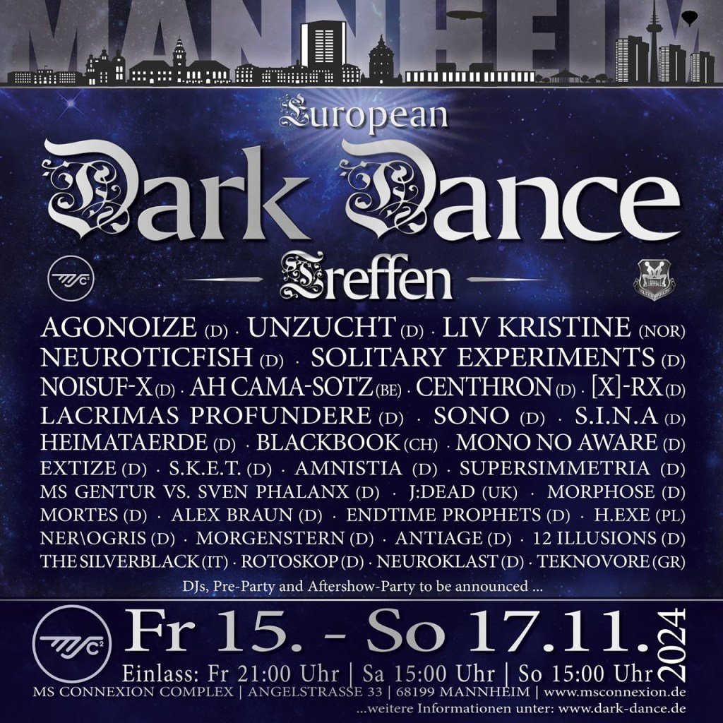Több mint nyolc évvel ezelőtt a lahri Dark Dance találkozó ajtaja bezárult és azt gondoltuk, örökre. Ritkán látni az egykor eltemetett fesztiválokat feltámasztva. De úgy tűnik a Super Schwarzes Mannheim csapata a European Dark Dance Treffen-t életre keltette és a tavalyi és az azelőtti nagy sikert követően idén is november közepére hirdette meg a három napos rendezvényt (valamiért ebben az évben egy nappal rövidebbre tervezték az eseményt) a tágas kulturális központban, a mannheimi MS Connexion Complexben. 3 színpadon 35 nemzeti és nemzetközi koncertet, 5 teremben 20 DJ-t terveznek. Péntek este hivatalos előpartin vehetünk részt, egyelőre még nincs meg, hogy melyik dj mikor fog játszani. Neuroticfish, Solitary Experiments, Blackbook, Alex Braun, Antiage biztosan lázba hozza a szintipop rajongókat. Nem csalódnak majd a keményebb aggrotech ütemekre vágyók, valamint a noise/indusztriál kedvelői sem, Agonoize, Noisuf-X, Centhron, X-RX, Teknovore, Hexe, Amnistia, S.I.N.A, Ner\ogris, S.K.E.T, Ah Cama Sotz, Supersimmetria, de a gitáros zene szerelmesei is találnak majd kedvükre való bandákat, Liv Kristine, Unzucht, Lacrimas Profundere, Heimataerde, Morgenstern, The Silverblack, csak hogy a nagyobbakat említsük.