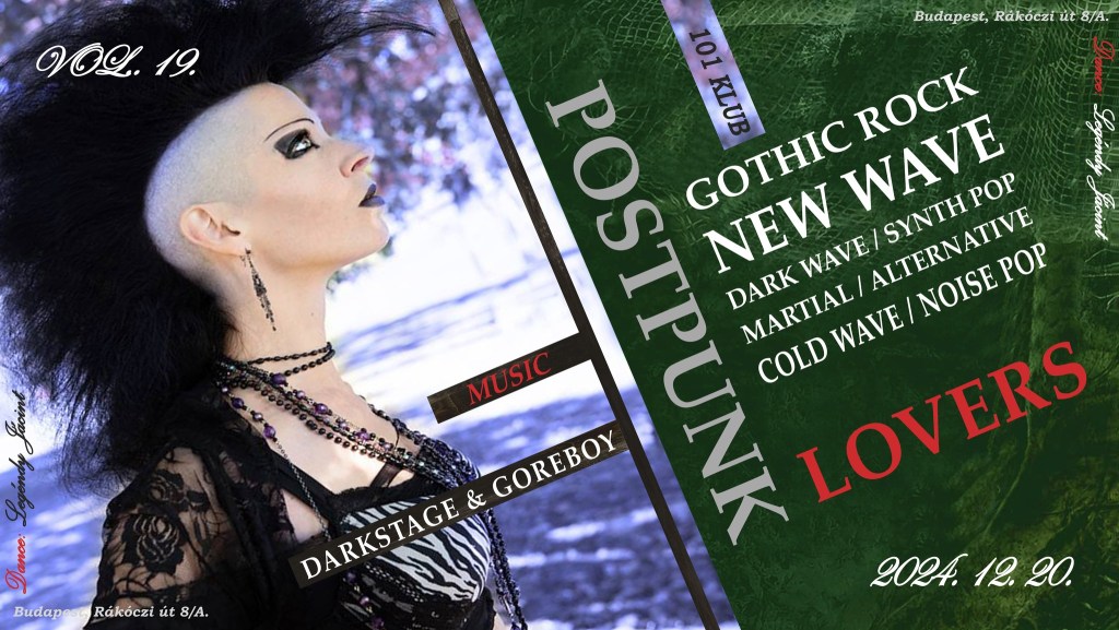 Postpunk Lovers címmel a 101 Klub december 20-án immár karácsonyi hangulatban folytatja új partisorozatát, amelynek zenei kínálata jórészt a ’80-as, illetve a ’90-es évek underground világára összpontosít, s főleg a darkwave, a posztpunk, a gothic és a coldwave bandák szerzeményeit veszi alapul, persze, a kortárs tendenciákra is figyelve. A nagyjából havonta megrendezésre kerülő bulikon az alternatív színtér legismertebb és legérdekesebb lemezlovasai, egyúttal művészei válogatják az említett stílusirányzatokhoz tartozó zenekarok elborultnál elborultabb számait. Vagyis a vendégek a Postpunk Lovers csapatának rezidens tagjaival, az olasz Numával és Goreboy-jal, esetleg a CMC vezetőjével, Szász Györggyel, ugyanakkor a londoni klubokat is megjárt Heretic társaságában a ZegZug egykori DJ-jével, Cuclikopffal, alkalmanként pedig a Tulpen und Narzissen csapat sötétvörös, illetve koromfekete hajú lemezlovasával, azaz Diánával és Dorinával találkozhatnak a pult mögött. S ahogy az elmúlt időszak hasonló jellegű rendezvényeit, a Postpunk Lovers bulijait is a ZegZugbeli vagy éppen berlini fellépéseiről ismert avantgárd költő, Legéndy Jácint improvizatív, táncos performanszai ékesítik, de külföldi DJ-k és alternatív bandák szereplése ugyancsak valószínűsíthető. A közönségen belül várhatóan felbukkannak a budapesti underground szcéna legextravagánsabb figurái, szóval a buli kihagyhatatlan élmény mindenkinek, aki el szeretne mélyülni a város zenei szubkultúráinak világában.