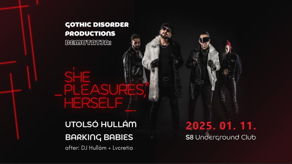 Portugáliai erotikus dark wave She Pleasures Herself, magyar dobgépes gothic rock Utolsó Hullám és ugyancsak magyar post punk Barking Babies. A koncertek után pedig visszatér a Disorder Night Lvcretiával és Dj-Hullámmal kifulladás utánig!