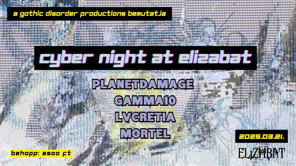 Rendhagyó, illetve maga után rendet egyáltalán nem hagyó pinceromboló felállással vár titeket ezúttal a DisoProd és vendégei az ElizaBAT mélyén, ahol a neonfényes – krómos – fémes árnyalatokban játszó, sötét jövőbeli hangorgiáké lesz a főszerep egy éjszakára. Fellép a sci-fi inspirált dark-electro Gamma10, az electroindustrial fenegyerek Planetdamage, majd az END-ből is ismert Mortel és a rezidens dj Lvcretia osztoznak a keverőpulton, kompromisszummentes industrial, futurepop, cybergoth és EBM darkdiscot szabadítva rátok.