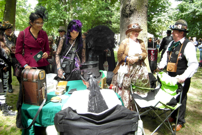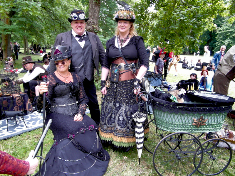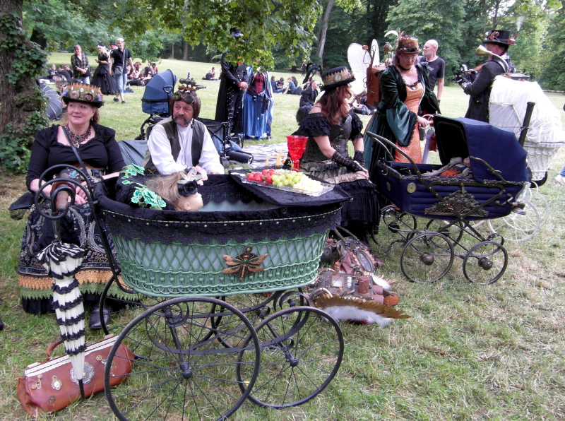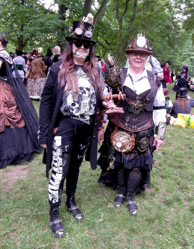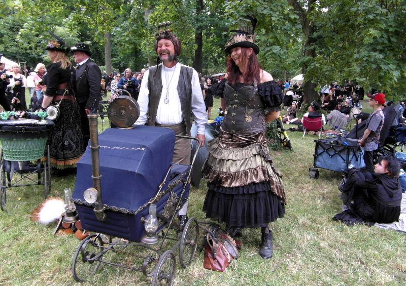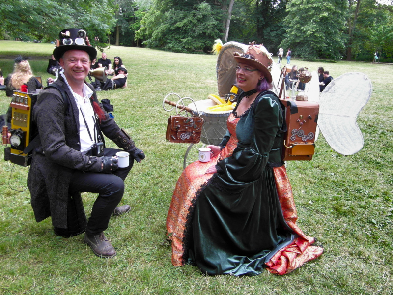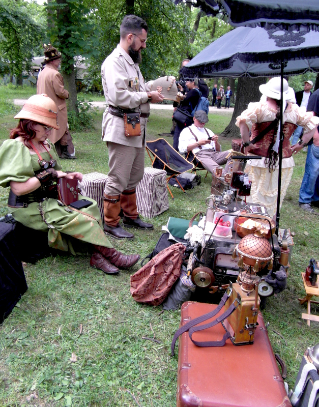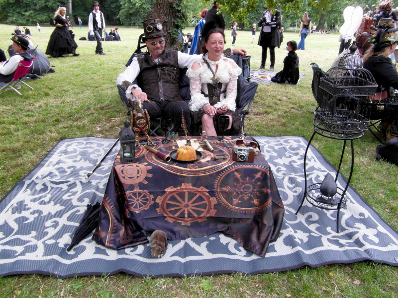 Szombat kora délután sor került a tizenegyedik Steampunk Piknikre is. Bár nem volt olyan látogatott, mint az előző napi Viktoriánus Piknik, mégis sikeresnek tekinthető. A saját készítésű, futurisztikus megjelenésű ruhák mellett büfé is működött, a kínálat az egyszerű falatoktól az igényesen megformált hengeres tortákig terjedt. Itt is voltak bámészkodók, de közel sem annyian, mint tegnap. Az időjárás sem nagyon kedvezett a szabadtéri étkezésnek, sötét felhők érkeztek, engem pont a villamosról leszállva kapott el a zuhé.