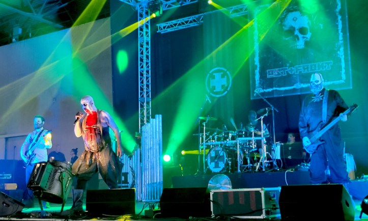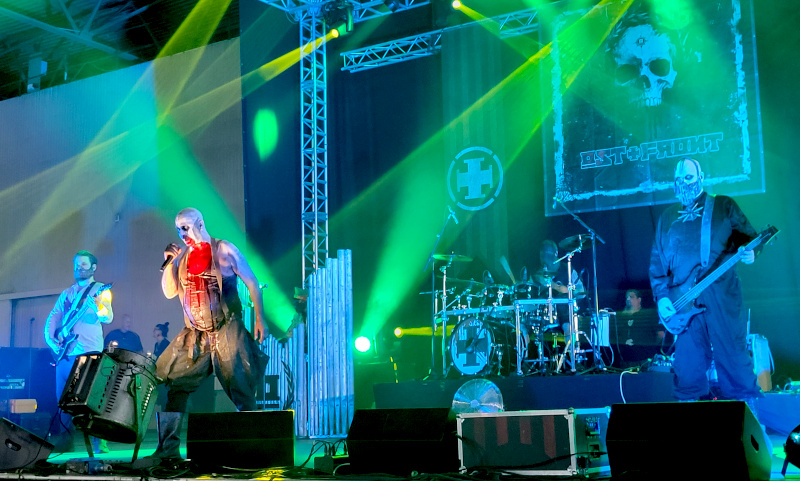 Igyekeztem át az Agra-ba, jól is tettem, az Ost+Front 10 perccel hamarabb kezdett, az nem derült ki, miért. A zenekarnak még az este legelején sikerült szinte teljesen megtöltenie a termet. A berlini együttes az új német keménységnek szentelte magát és nem csak szövegileg, hanem vizuálisan is provokatív: a zenészek erős sminkkel, maszkokkal, kopott kabátokkal, a Nemzeti Néphadsereg régi egyenruháival mutatkoztak be és természetesen rengeteg vérrel. Herrmann Ostfront megint úgy nézett ki, mint egy mészáros a 16 órás műszak után. Az agresszív gitárriffek és a szikár ének Rammstein-stílusban harci öltözékekkel párosítva, egy csipetnyi horror és egy jó adag szatíra biztosan nem való mindenkinek, de a banda szenzációs teljesítményével az extravagánsan öltözött tömeg többségénél elérte a célt. A „Fleisch” című dalnál például egy álarcos táncos a szokásos szexi módon forrósította fel a bandatagokat és a közönséget. Nem mintha ez szükséges lett volna a meleg miatt, de sokaknak határozottan tetszett. Volt, hogy az egyik női ruhába bújt tagnak húzta fel a szoknyáját és tolta le a tangáját az énekes és paskolt nagyokat a fenekére. A mellettem álló srác egy guminőt dobott fel a bandának a színpadra. A legnagyobb tombolást persze az utolsóként eljátszott „Bitte Schlag Mich” váltotta ki, ami közben fekete lufieregetés is volt.