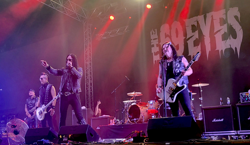 Aki volt már a finn The 69 Eyes koncertjén, az tudja, hogy az énekes Jyrki mellett Jussi dobos viszi hátán a showt. A mindig félmeztelen ütős most is hozta az összes kötelező rocksztár-pózt, úgy mint a nyitott szájjal rágózást vagy éppen a dobjaira való rámászást. Az ismét hosszú hajjal nyomuló énekes és csapata nem bízta a véletlenre a dolgot, az intró után jövő „Devils“/„Feel Berlin“/„Betty Blue“/„Perfect Skin“/„Drive“ ötös egyből magas hőfokra tette a hangulatot, ezek után már nem lehetett hibázni, zsebben volt a buli. Később is rendre jöttek a régi sikerdalok („Chair“, „Gothic Girl“, „Wasting The Down“) egy-két új nóta (a Boycott féle „Gotta Rock“, „Death Of Darkness“) kíséretében. A „Brandon Lee” után lementek a színpadról, de a hatalmas taps megtette a hatását, nem mehettek el a „Dance d’Amour” és a „Lost Boys” nélkül. Jyrki ezután köszönetet mondott a rajongóknak, mondván: “Egy cseppet sem változtatok, tudjátok miért? Rohadt vámpírok vagytok!” 😀