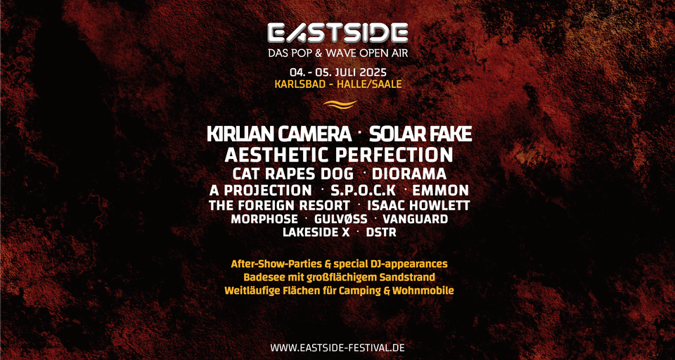 A kétnapos Eastside fesztivált 4. alkalommal rendezik meg július első hétvégéjén a németországi Halle-ban, a Karlsbad – Angersdorfer tavaknál, amit három, 1925-ig üzemelt egykori agyaggödör megmaradt üregében hoztak létre, amit a felszálló talajvíz és esővíz töltött meg. A természetes tó területe 5 hektár, átlagos vízmélysége 2,50 méter, maximális vízmélysége pedig 8 méter, valamint strandja körülbelül 100 méter hosszú. A víz enyhén sós, ami valószínűleg egy földalatti sósvíz beáramlásnak köszönhető, így ez az egyetlen sós tó a régióban. Kültéri medenceként, rendezvényhelyszínként és helyi rekreációs területként is használják. Kifejezetten a fesztivál alkalmából kempinget és különféle gasztronómiai látványosságokat helyeznek majd el a helyszínen. A zenei színfoltok mellett gótikus termékekkel, változatos szabadidős programokkal, napközbeni zavartalan fürdőzési lehetőséggel várják a vendégeket. A jegyár itt nem foglalja magába automatikusan a kempingbe való belépést, külön kell venni a fesztiválbérlet mellé sátorjegyet is. A szervezők olyan zenei irányvonalat kínálnak a nagyérdeműnek, amely a fekete színteret valaha is alakította. Solar Fake, Aesthetic Perfection, S.P.O.C.K, Diorama, Emmon, Vanguard, Morphose, Isaac Howlett, Lakeside X, Piston Damp biztosan lázba hozza a szintipop és EBM rajongókat. Nem csalódnak majd az darkwave/posztpunk hangzások rajongói sem, Kirlian Camera, A Projection, The Foreign Resort, Cat Rapes Dog, Gulvoss játszik majd nekik. A koncertek után minden este helyi dj-k várják a táncos lábúakat, akik az afterpartikon a szcéna legnépszerűbb szintipop, wave, 80as, gót és ebm slágereivel készülnek, pénteken nem más, mint Daniel Mayer kapta ezt a harci feladatot.
