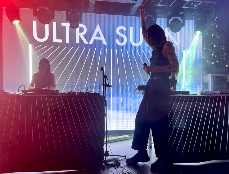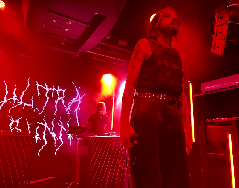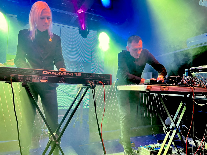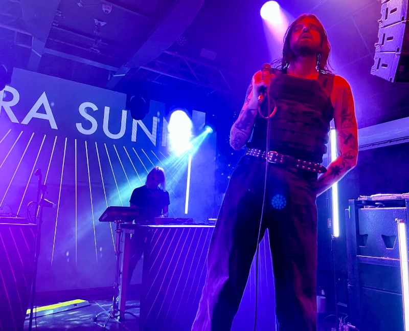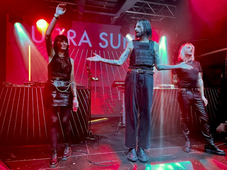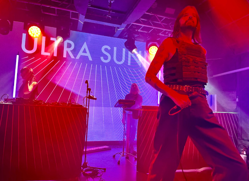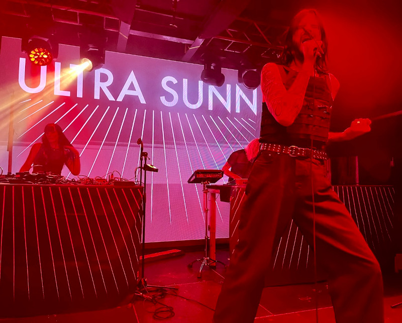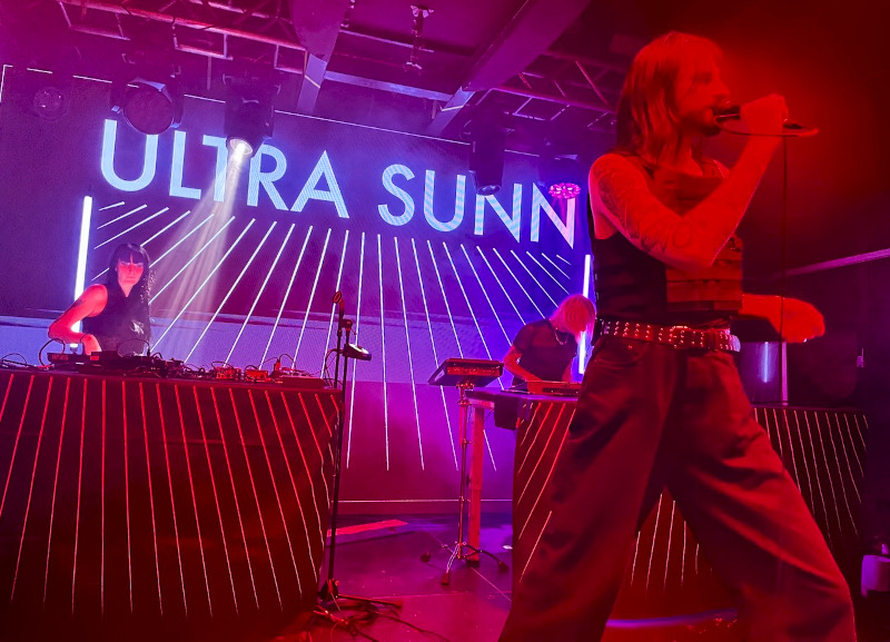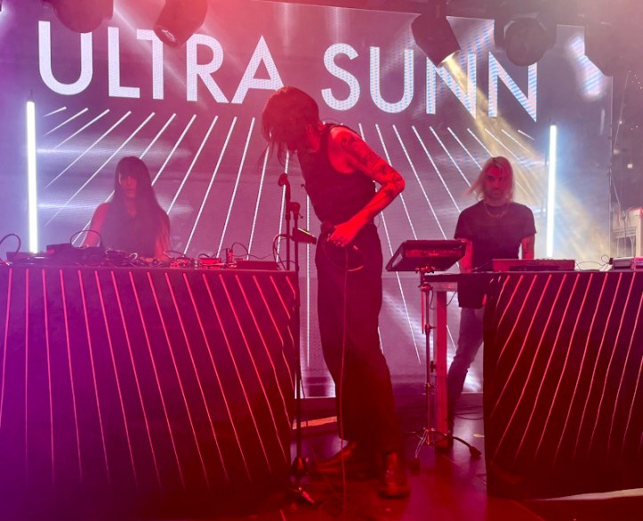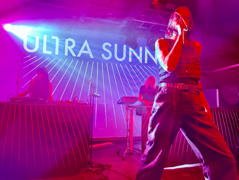 Az Ultra Sunn koncertje feszesen felépített, vizuálisan is erős élményt nyújtott, ahol a dalok sorrendje és a kivetítőn megjelenő elemek szinte egy külön dramaturgiát alkottak. Az est egy hatásos intróval indult, amely azonnal megalapozta a sötét, mégis energikus hangulatot, majd sorban érkezett a „The Speed” és a „Young Foxes“. Ezután rövid „köszönöm” hangzott el a színpadról, de a lendület egy pillanatra sem tört meg. Az elegánsan visszafogott billentyűs Gaelle Souflet, az énekes Sam Huge és az élő koncerttag, Alexis Andrigo továbbra is kompromisszummentes, dübörgő EBM hozzáállást tanúsított.