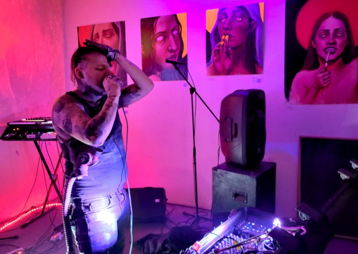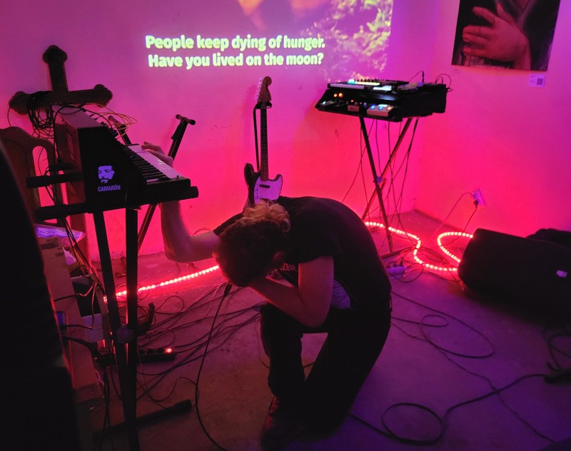 Az énekes bőrdzsekiben kezdett, amit hamar levetett és egy szál atlétában folytatta tovább, mintha fizikailag is levetkőzné a civilizáció felszínes rétegeit. Az egyik számnál egy tábornoki sapkát is felvett, ironikus vagy épp fenyegető gesztusként, nehéz eldönteni. Többször bejött a közönség közé is, ami ilyen kis létszámnál már-már zavarba ejtően intim közelséget jelentett. A hangszereit egy nyitott, bőröndszerű ládából kezelte, gombokat és potmétereket csavargatva. A jellegzetes hangzás dobokból, basszusszekvenciákból, roncs ütőhangszerekből, alkalmankénti szintetizátor-vezetőből és énekből állt össze. A minimalista dalszövegek a személyes és társadalmi hanyatlás témáit járták körül. Az egész produkció inkább hatott rituálénak, mint hagyományos koncertnek. A kevés néző ellenére – vagy talán épp amiatt – a hangulat egy fojtogató, ipari világba rántotta le a jelenlévőket. Nem csupán koncertet kaptunk, hanem egy intenzív, érzékszervi túltelítettségig fokozott élményt, ahol a bunker-esztétika és a nyers elektronika életre kelt.
