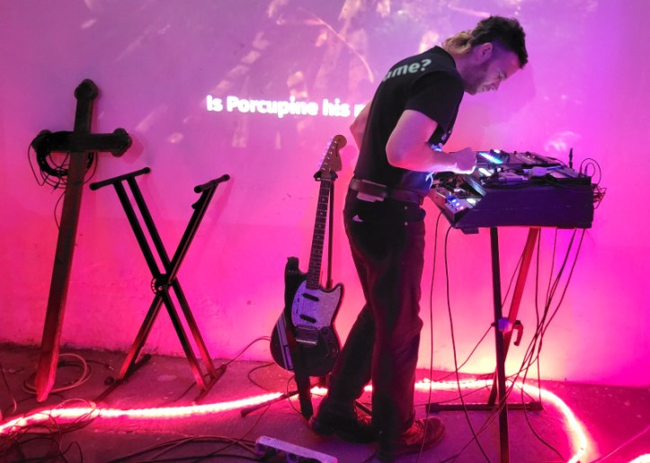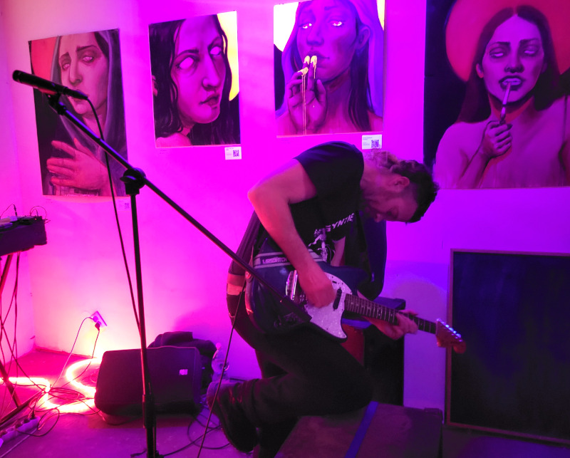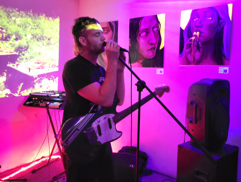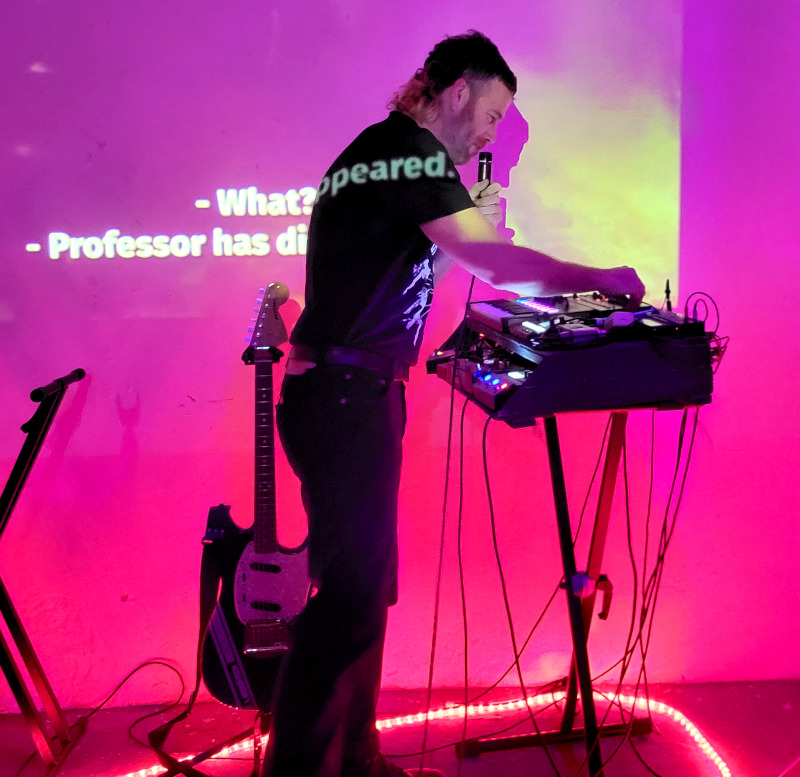Rövid átszerelés után érkezett is Larsovitch, azaz Théo Guilvard Franciaországban indult underground zenei projektje, amely 2020 végén jött létre a montpellier-i Friche Mimi művészeti közegében. Tulajdonképpen miatta mentem le aznap a pincébe, mivel annyira tetszett a tavaly őszi hajós koncertje. Az intró után máris erősen kezdett, a legutóbbi album orosz nyelvű „Obossrannyi Gueroï “( a Svidetelstvo o Smerti egyik dalának feldolgozása) dübörgő, energikus synth-punk alapjai azonnal mozgásba hozták a közönséget és rögtön táncra csábították a jelenlévőket. A francia „Légions Perdues” az elszigeteltség, a történelmi és személyes bukás, valamint a kiábrándultság köré épült. A dalszöveg hangulata inkább borongós, mint dühös, nem a lázadásról, hanem a csendes felismerésről szólt. A visszafogottabb és intimebb „Bonne Nuit“-nál már gitárt ragadott, egyszerre nyugodt és nyugtalanító módon kívánt jó éjszakát.