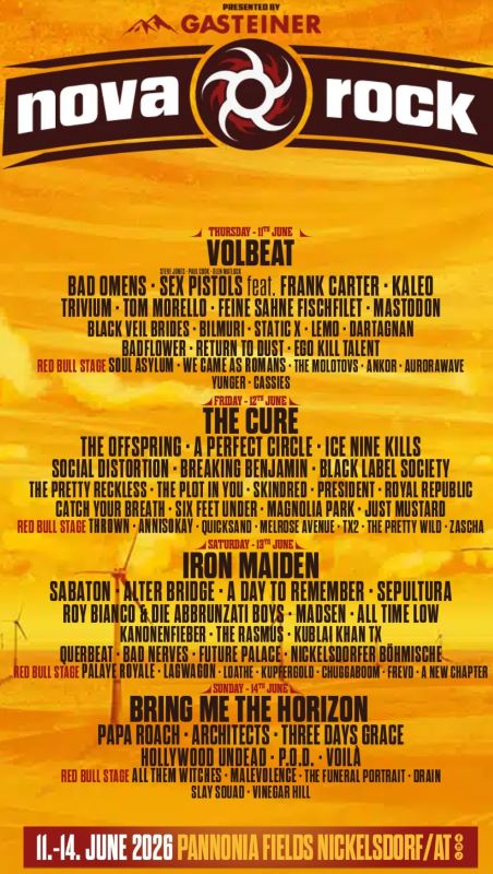 Idén is megrendezésre kerül Ausztria legkeletibb tartományában, Nickelsdorfban a 2005 óta létező Nova Rock. A magyar és szlovák határ közelében lévő négynapos, több mint 200.000 látogatót vonzó fesztivál ebben az évben jubilál, ugyanis a 20. évfordulóját ünnepli június közepén. A fesztivál line-up a headliner előadókon túl is rendkívül impozáns. A négy nap alatt közel száz fellépő szórakoztatja majd a közönséget. A nyitónapon a kemény rockot, a metált és a rockabilly elemeit egyedülállóan ötvöző Volbeat, a brit punk mozgalom szíve és ökle Sex Pistels feat. Frank Carter, a glam rockot játszó Black Veil Brides, a Static-X amerikai indusztriál és nu metal együttes, a német folk DArtagnan és ki ne emlékezne a minnesotai Soul Asylum ” Runaway Train ” slágerére. Pénteken a tupírhajú Robert Smith által vezetett The Cure, a los angelesi punk The Offspring, az amerikai Perfect Circle, vagy a bécsi androgün Zascha lép fel. Szombaton érkezik az angol heavy metál Iron Maiden, a svéd power metál Sabaton, a Cavalera-testvérpár által alapított brazil Sepultura és a finn The Rasmus. A vasárnapot a sheffieldi Bring Me The Horizon, az amerikai nu metal Papa Roach, a brit metalcore Architects és a los angelesi pop-rock Voilá zárja.